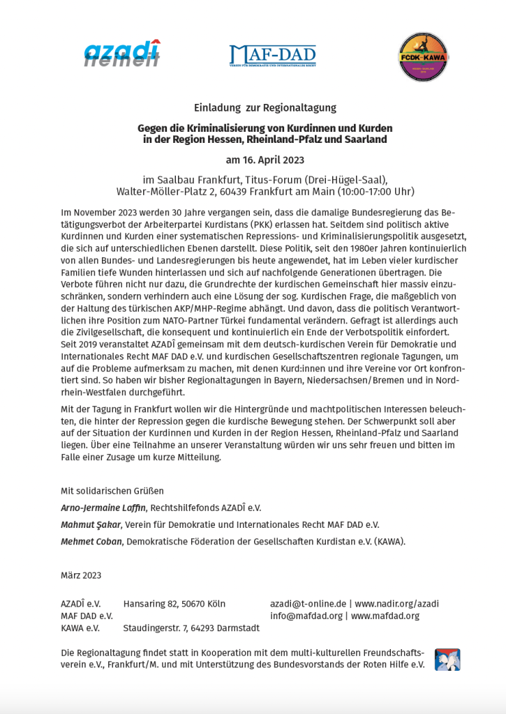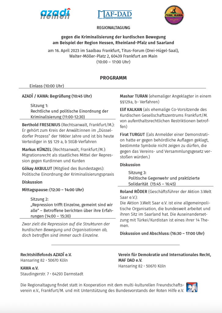 Regionaltagung 2023 Allgemein Fachtagungen&Konferenzen MafDadAdmin 27. März 202326. Dezember 2024 gegen die Kriminalisierung der kurdischen Bewegung am Beispiel der Region Hessen, Rheinland-Pfalz und Saarland am 16. April 2023
